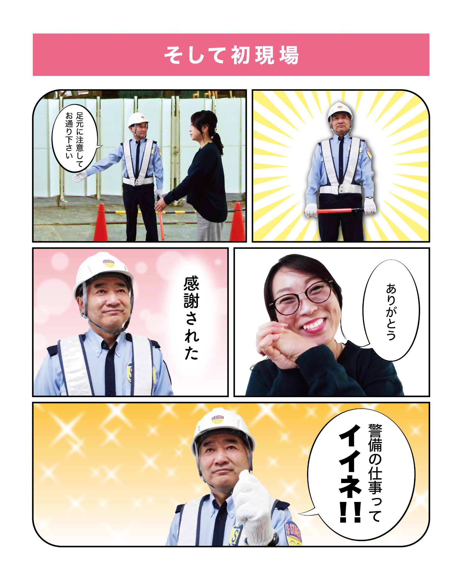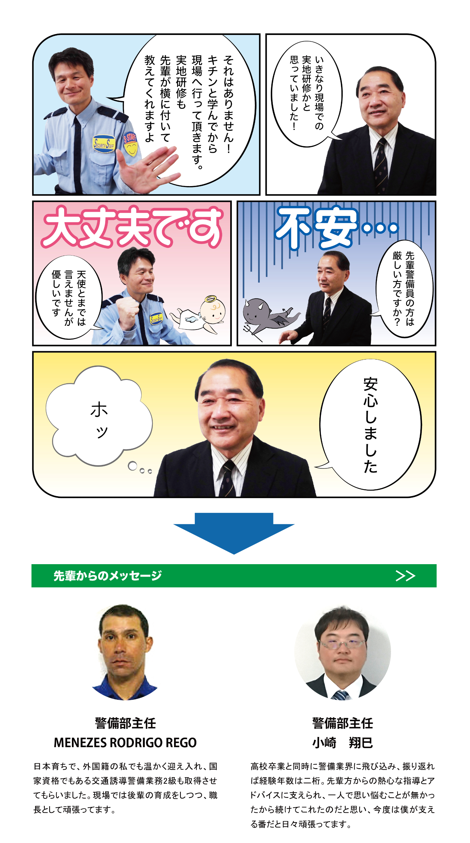 | 〇仕事内容 | 交通誘導・雑踏警備員 本人の希望に応じて施設警備員、教育担当者、営業担当者などに進んで頂く場合有り |